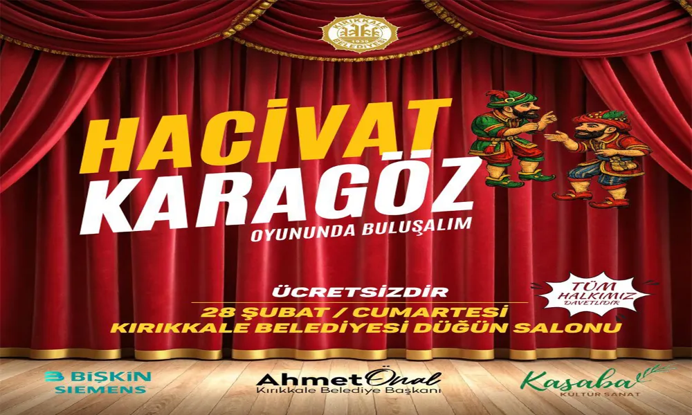 Kırıkkale Belediyesi, kültürel etkinlikler kapsamında geleneksel gölge oyunumuzun unutulmaz kahramanlarını sahneye taşıyor. "Hacivat Karagöz Oyununda Buluşalım" sloganıyla duyurulan etkinlik, hem çocuklara hem de yetişkinlere nostaljik ve eğlenceli bir atmosfer sunacak.