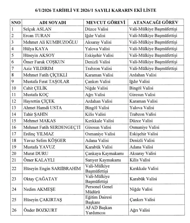 Kararname kapsamında Kırıkkale Valisi Mehmet Makas, Düzce Valiliğine atanırken, Vali-Mülkiye Başmüfettişi Hüseyin Engin Sarıibrahim ise Kırıkkale Valisi olarak görevlendirildi. Yeni atamaların ardından Hüseyin Engin Sarıibrahim’in önümüzdeki günlerde Kırıkkale’de görevine başlaması bekleniyor.